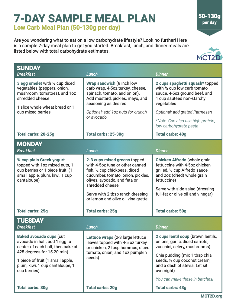 Total carbs: 25g | Chicken Alfredo (whole grain fettuccine with 4-5oz chicken grilled, ½ cup Alfredo sauce, and 2oz (dried) whole grain fettuccine) Serve with side salad (dressing full-fat or olive oil and vinegar)