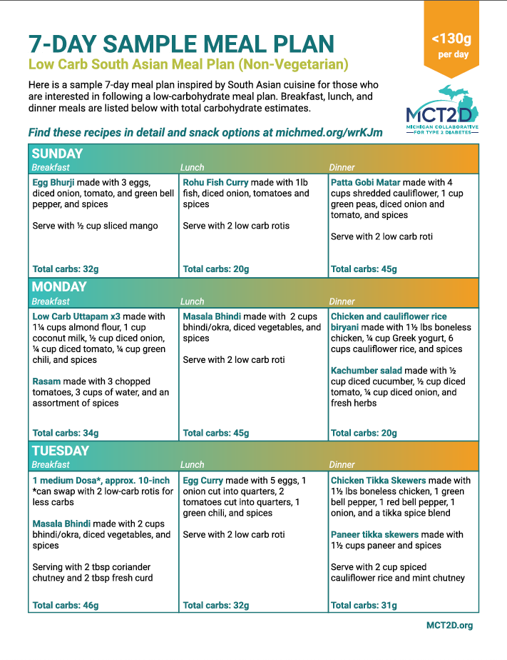 Total carbs: 20g | Patta Gobi Matar made with 4 cups shredded cauliflower, 1 cup green peas, diced onion and tomato, and spices Serve with 2 low carb roti