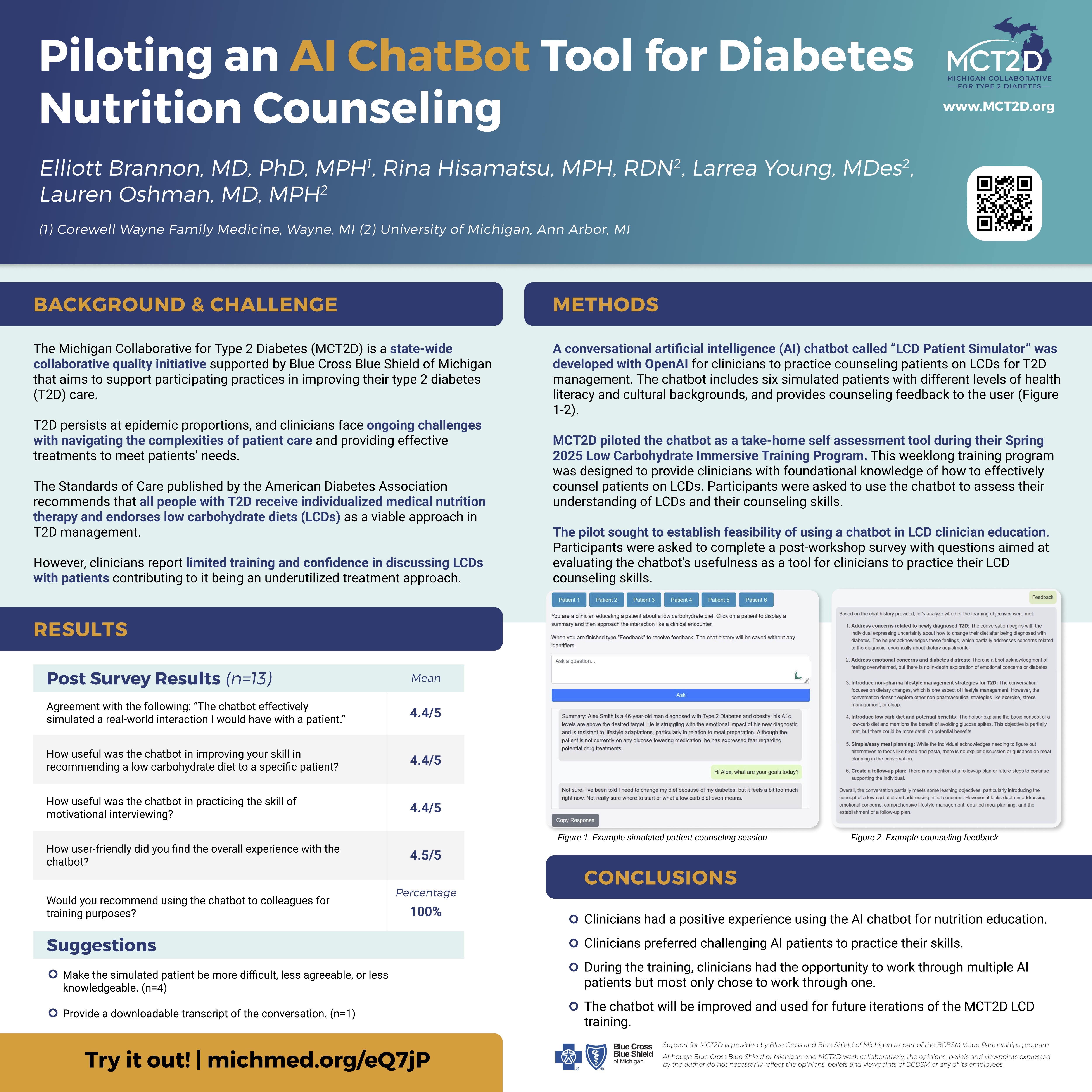 To address this gap, MCT2D developed a novel training program combining evidence-based instruction, empathy-driven exercises, and an AI-powered patient simulator for primary care teams interested in strengthening their low carb counseling for patients with type 2 diabetes.